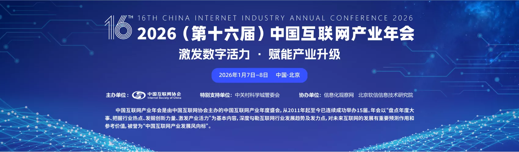 2026年是“十五五”开局之年,为助力互联网及相关行业“十五五”高质量发展谋篇布局,中国互联网协会拟于2026年1月在北京举办“2026(第十六届)中国互联网产业年会”。