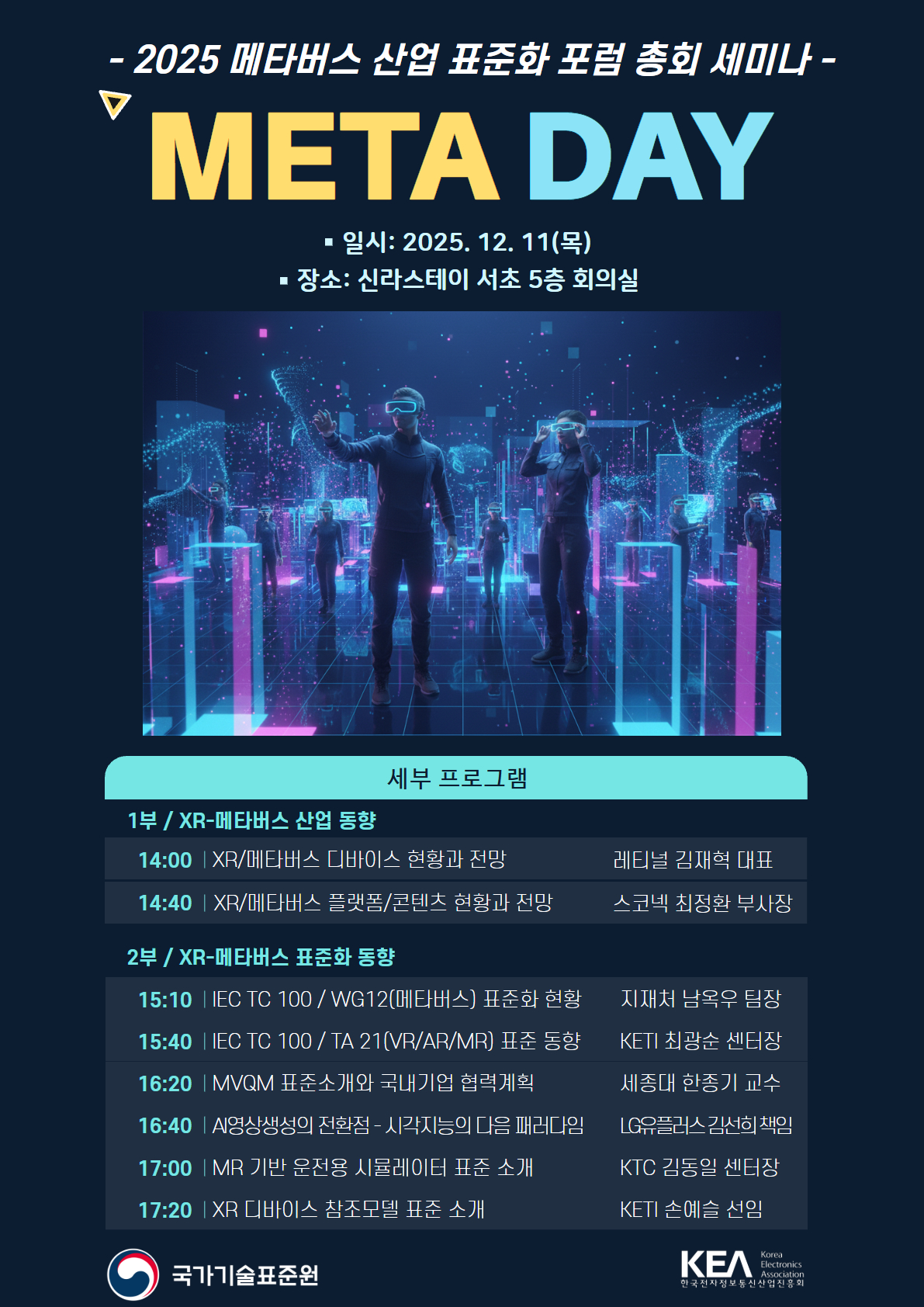 📌행사명 2025 메타버스 산업 표준화 포럼 총회 세미나 META DAY📌 이벤트 개요행사: 2025 메타버스 산업 표준화 포럼 총회 세미나 META DAY일 시 : 2025년 12월 11일 (목) 13시장 소 : 신라스테이 서초 5층세션 주제: MR-메타버스 산업동향, MR-메타버스 표준화 동향