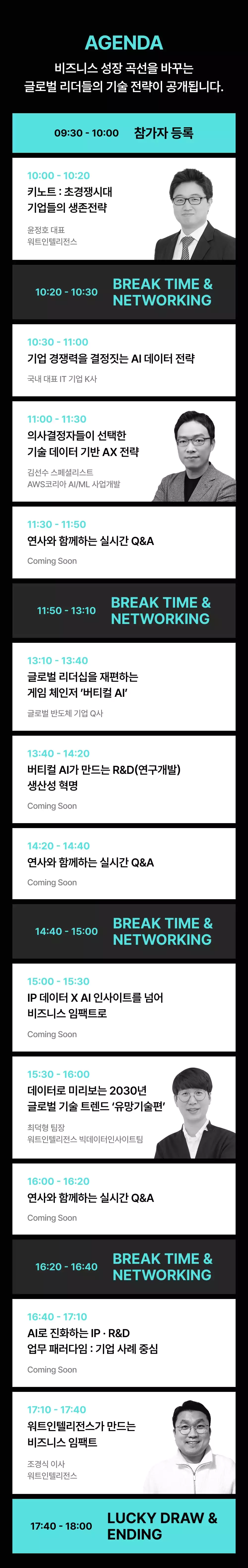 IP 리걸테크 선도기업 ‘워트인텔리전스’가 IP 데이터와 버티컬 AI를 결합해 비즈니스 전략과 기술 트렌드를 입체적으로 다루는 국내 최초의 기술 전략 전문 써밋입니다.