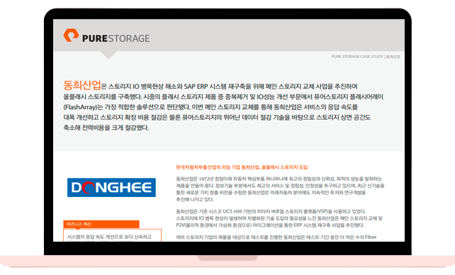 동희산업은 스토리지 IO 병목현상 해소와 SAP ERP 시스템 재구축을 위해 메인 스토리지 교체 사업을 추진하여 올플래시 스토리지를 구축했습니다. 시중의 플래시 스토리지 제품 중 중복제거 및 IO성능 개선 부문에서 퓨어스토리지 플래시어레이 (FlashArray)는 가장 적합한 솔루션으로 판단하였습니다. 이번 메인 스토리지 교체를 통해 동희산업은 서비스의 응답 속도를 대폭 개선하고 스토리지 확장 비용 절감은 물론 퓨어스토리지의 뛰어난 데이터 절감 기술을 바탕으로 스토리지 상면 공간도 축소해 전력비용을 크게 절감했습니다.