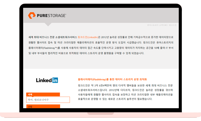 세계 최대 비즈니스 전문 소셜네트워크서비스 링크드인(LinkedIn)은 2012년 놀라운 성장률로 인해 기하급수적으로 증가한 데이터양으로 원활한 웹사이트 접속 및 미션 크리티컬한 애플리케이션의 효율적인 운영 방식 도입이 시급했습니다. 링크드인이 어떻게 사용자의 데이터 접근 속도를 단축시키고 고용량의 데이터가 차지하는 공간을 10배 줄여 IT 부서 및 내부 부서들이 합리적인 비용으로 최적화된 데이터 스토리지 운영 플랫폼을 구축할 수 있었는지 확인해보세요!