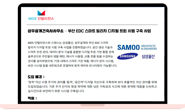 MDS 인텔리전스와 스탠스는 삼성물산, 삼우설계와 부산 EDC(Eco Delta City) 스마트 빌리지에 디지털 트윈 기술로 사물인터넷(IoT)을 통해 수집된 데이터를 토대로 관제, 비상 상황 대응은 물론 시뮬레이션을 통해 가상 상황을 예측할 수 있도록 효율적 설계를 진행하였습니다. 어떻게 기존 주거 단지의 현장 파악에 대한 낮은 가독성과 사고에 대한 취약한 대응을 신속하게 실시간으로 보안할 수 있었는지 확인해보세요!