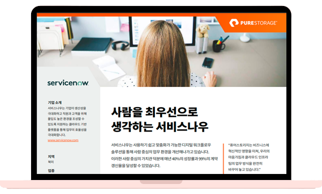그러나 최근 증가하는 데이터 볼륨과 서비스나우 플랫폼을 이용해 지속적으로 혁신을 추진하는 고객 기반의 확장 속도에 보조를 맞춰야 하는 중대한 문제에 직면했습니다. 이러한 문제를 해결하기 위해 스토리지 환경을 현대화하는 방안을 검토하게 되었으며, 이 과정에서 주요 클라우드 공급업체로는 처음으로 올플래시 데이터센터로 전환을 하게 되었습니다. 어떻게 ServiceNow가 퓨어스토리지를 사용하여 탁월한 고객 경험을 제공하는 올플래시 데이터 센터를 채택한 최초의 주요 클라우드 제공업체가 되었는지 확인해보세요!