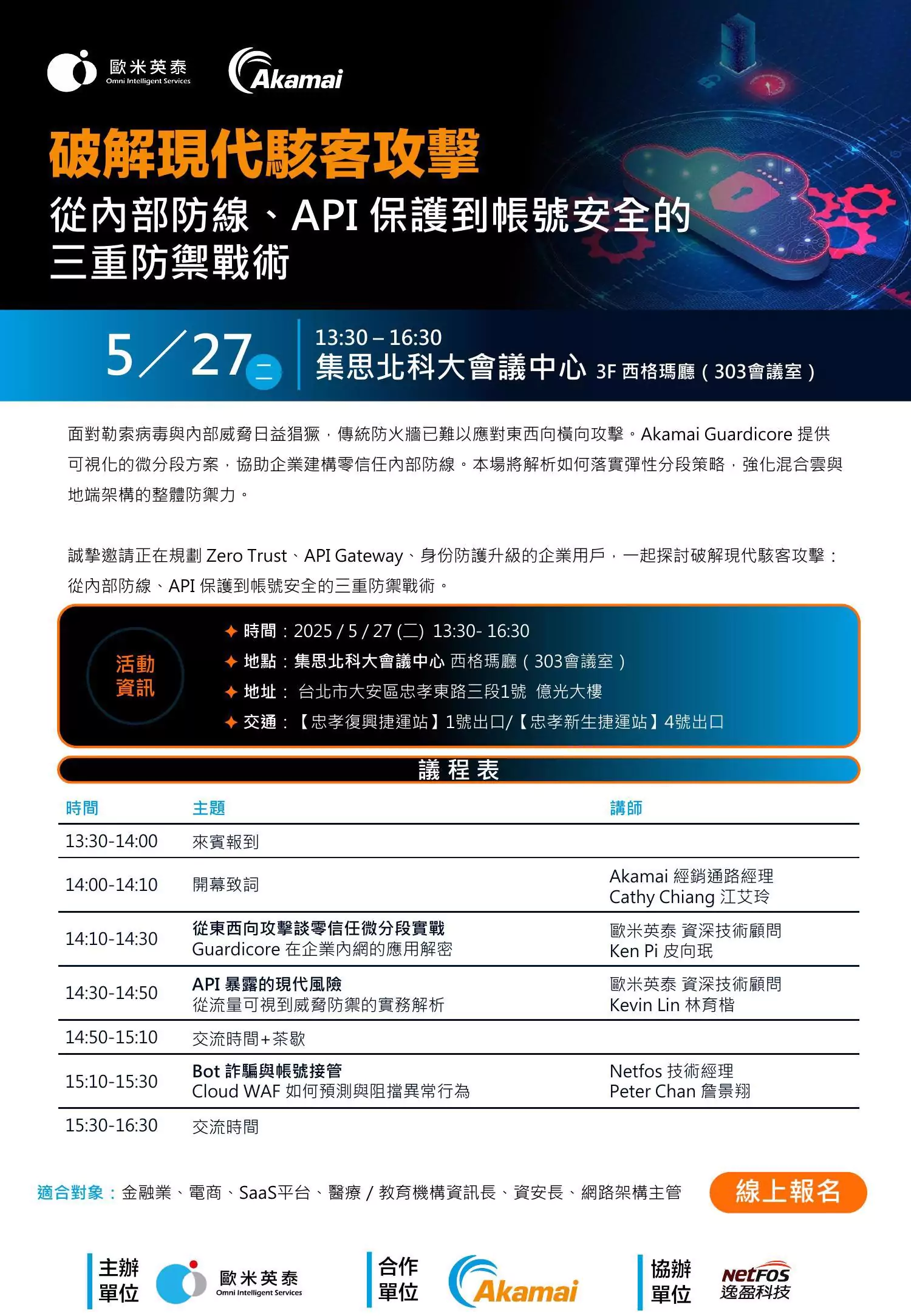 面對勒索病毒與內部威脅日益猖獗,傳統防火牆已難以應對東西向橫向攻擊。Akamai Guardicore 提供可視化的微分段方案,協助企業建構零信任內部防線•本場將解析如何落實彈性分段策略,強化混合雲與地端架構的整體防禦力。