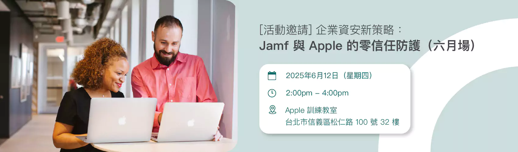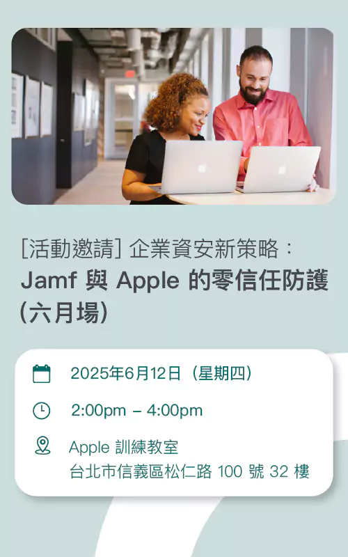 在活動中,Jamf 捷飛科技 將透過實務操作展示 Apple-First, Apple-Best 的全方位行動裝置管理(MDM)及端點保護解決方案,並特別分享如何透過 零接觸(Zero Touch) 完成 零信任(Zero Trust) 部署。