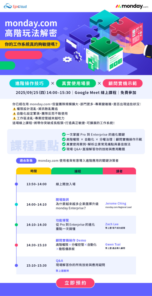 這場由 聚上雲 Epic Cloud × monday.com 聯合舉辦的線上研討會, 將帶您快速掌握最新趨勢與實戰應用: