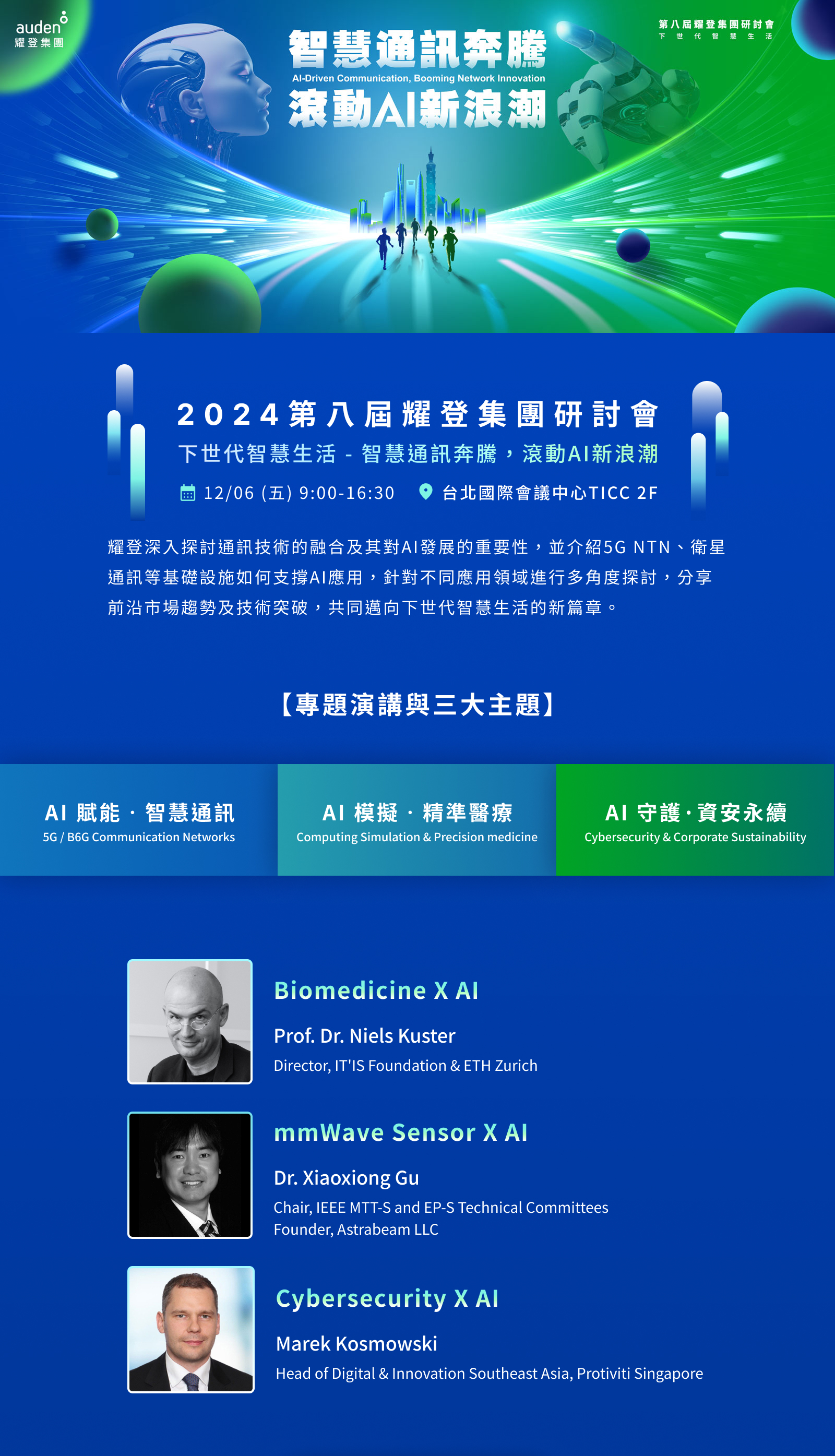 耀登深入探討通訊技術的融合及其對Al發展的重要性,並介紹5G NTN、衛星通訊等基礎設施如何支撐Al應用,針對不同應用領域進行多角度探討,分享前沿市場趨勢及技術突破,共同道向下世代智慧生活的新籥章.
